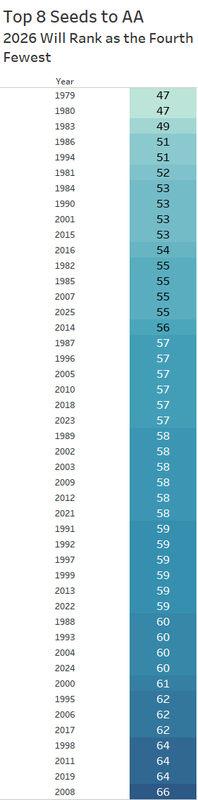 With only 50 wrestlers seeded 8th or higher in the 80 AA slots, 2026 will rank as the fourth fewest AA's from AA position.