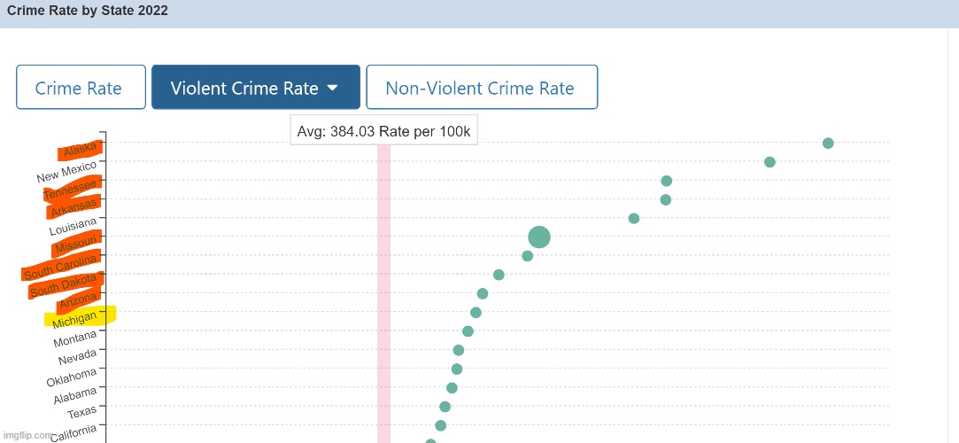 As far as violent crime. They rank 10th, and they actually are the 10th most populous state, so that's pretty proportional. That is also behind 7 Republican states. Why are those 7 republican led states so high?