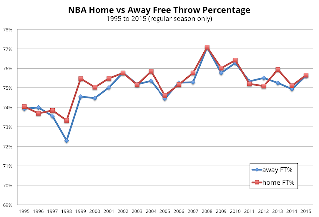 there is plenty of evidence that home courts in NBA and NCAA provide very little difference in FT shooting between home and road teams. While it seems like it should, it just doesn't matter.