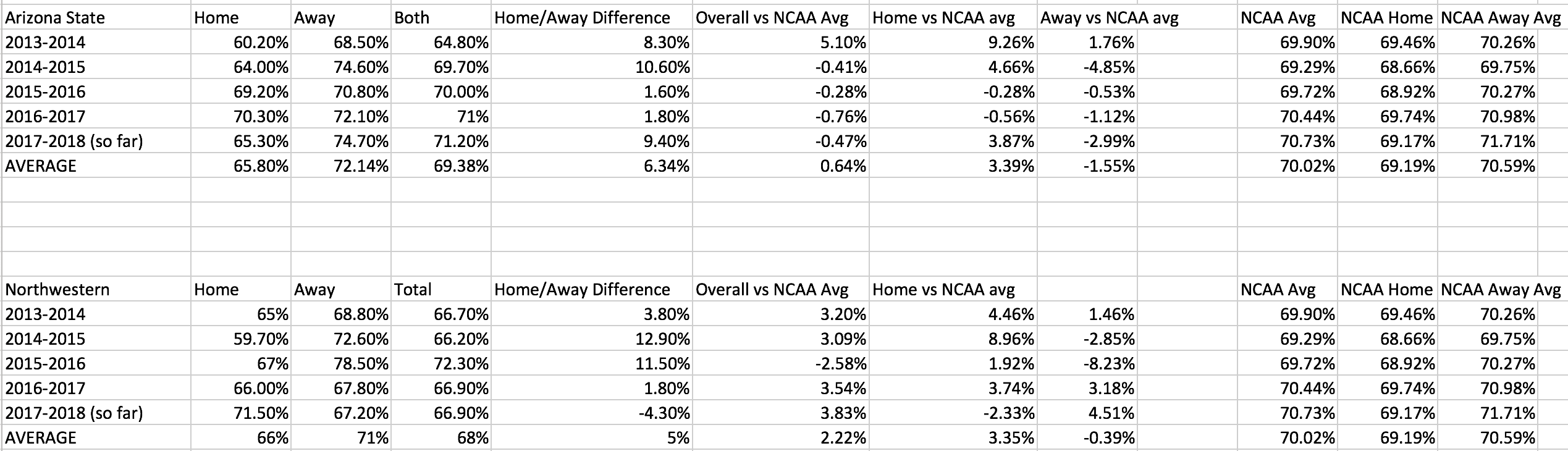 I agree with blockm2 for the most part, but -- despite the background noise -- according to https://www.teamrankings.com/ncaa-basketball/stat/opponent-free-throw-pct, Arizona State (of the "Curtain of Distraction" fame) and Northwestern have both been about 3.3-3.4% better than the average team at home free throw defense (see my worksheet below) from the last 5 "seasons"... 2013-2014 through yesterday (and there's already about a 1.4% difference between home and away free throw percentages). But instead of +7.5% home/away differential of Welsh-Ryan 2013-2017, the Wildcats are -4.3% so far this year. Luck? Environment? A little bit of both probably, but it does make me wish for the better free throw defense of yore!
