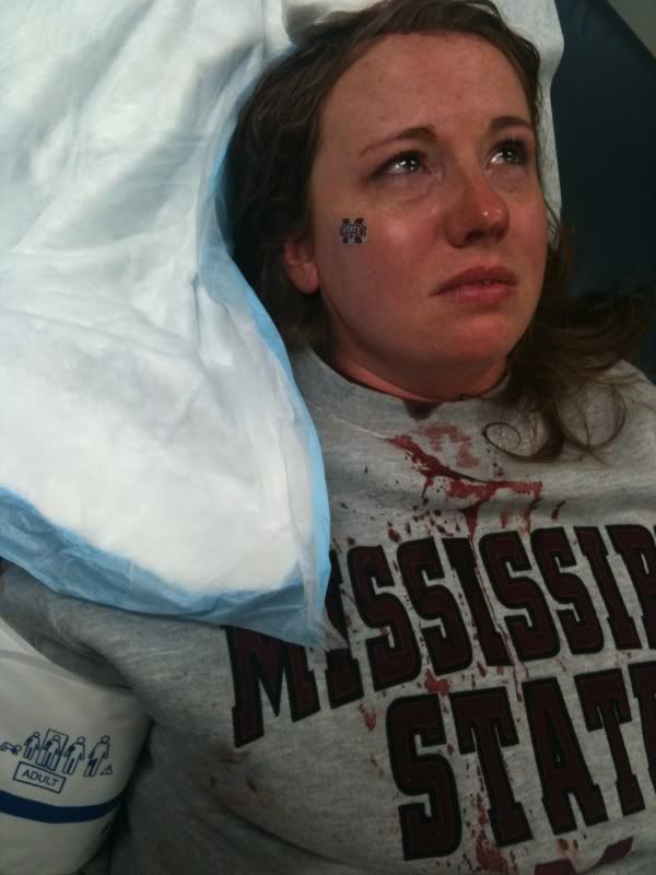 Instinct kicks in and I just want to get her to the field. Everyone around us was in total celebration so I had to scream profanities and shove our way to the field. All I can tell my wife is "I'm sorry, it'll be ok". All the while she is screaming unable to see because of the blood covering her face. We make it through the field and to the first aid station where she is told that she definitely was going to have to have staples to close the wound. Three hours later, we are on our way home to Clinton with a bad taste in our mouths and 5 staples in her head.