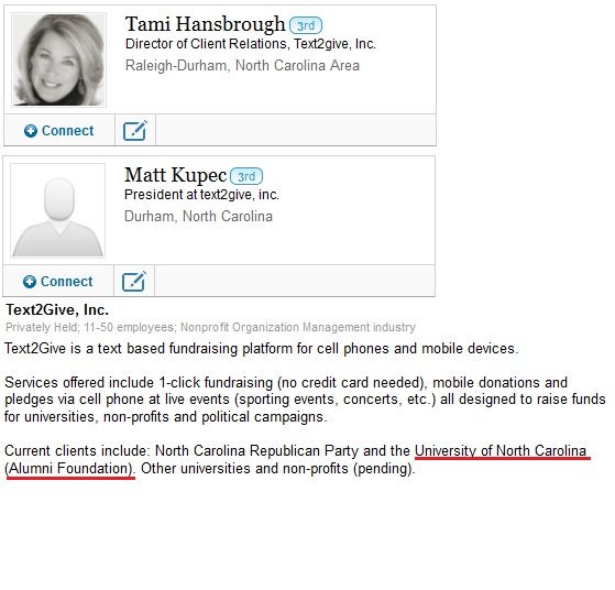 unx obviously agreed. They garnished Matt's last check and let it go. That was much easier than pressing charges vs 'im and havin' the ex-quarterback reveal where the skeletons are buried. Here's the kicker though. It's illustrated above in the ad for "Text2Give." unx fires Matt for his criminal behavior yet when Kupec goes out and starts another business , unx HIRES 'im again! Ya can't make this stuff up! Generally speaking , former employees who misappropriate funds while committing adultery on the tax-payer's dime don't get re-hired at the institution that canned 'em...except at unx. #carolinaway
