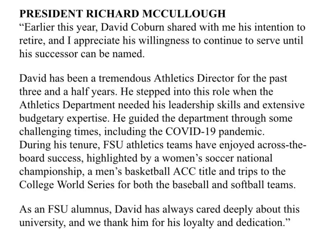 “David has been a tremendous athletic director for the past three and a half years. He stepped into this role when the Athletics Department needed his leadership skills and extensive budgetary expertise,” said McCullough. “He guided the department through some challenging times, including the COVID-19 pandemic. During his tenure, FSU athletics teams have enjoyed across the board success, highlighted by a women’s soccer national championship, a man’s basketball ACC title, and trips to the College World Series for both the baseball and softball teams.”
