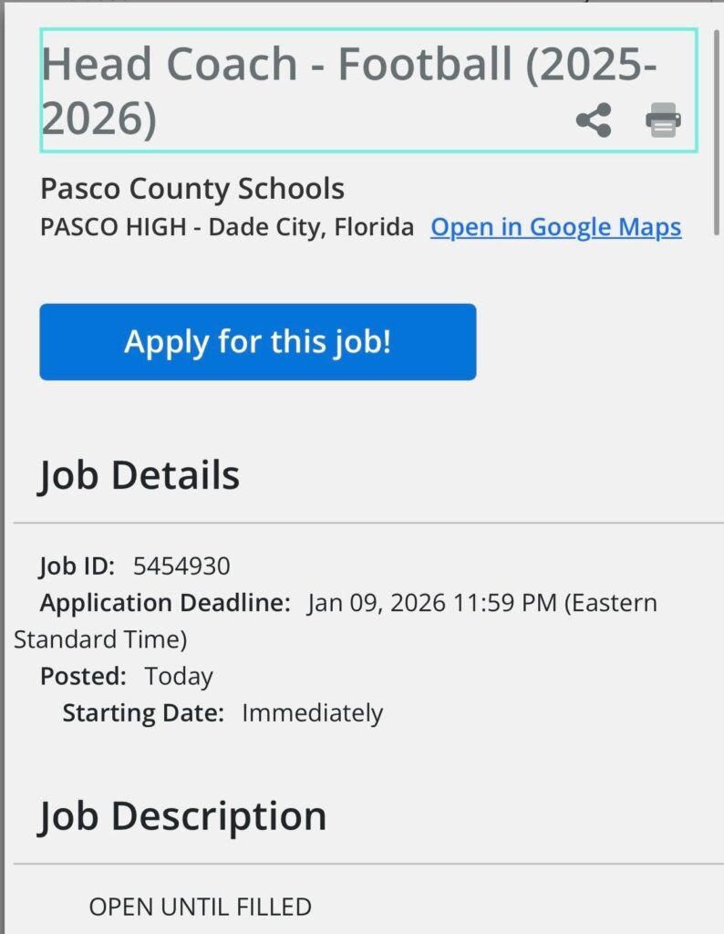 Pasco (Fla.) is apparently on the search for another head football coach, according to a job posting by Pasco County Schools on Tuesday morning.