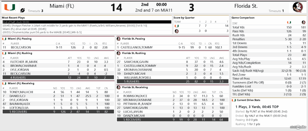10/04/2025 07:59:21 PMFlorida State and Miami have now traded offensive drives, with both teams settling in a bit more defensively. This is a key stretch for Florida State before the half. Miami will get the ball first out of the break, so a score here seems somewhat paramount for Mike Norvell’s bunch.