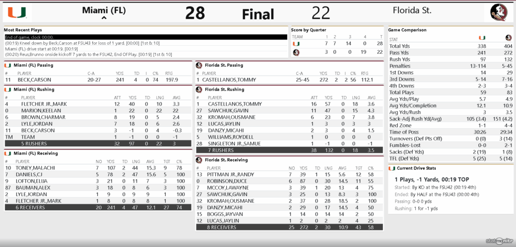 10/04/2025 10:19:49 PMThe game has gone final, and Miami has outlasted Florida State to take home a key road win. Here are the final statistics for the game. And that will do it for our live coverage tonight. Thanks for following along!