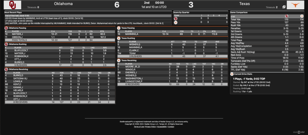 10/11/2025 04:09:19 PMPoints were hard to come by in the first half of the Red River Rivalry game as Oklahoma took a 6-3 lead into halftime. The Sooners totaled 170 yards of offense through two quarters while the Longhorns had 114 at the break.