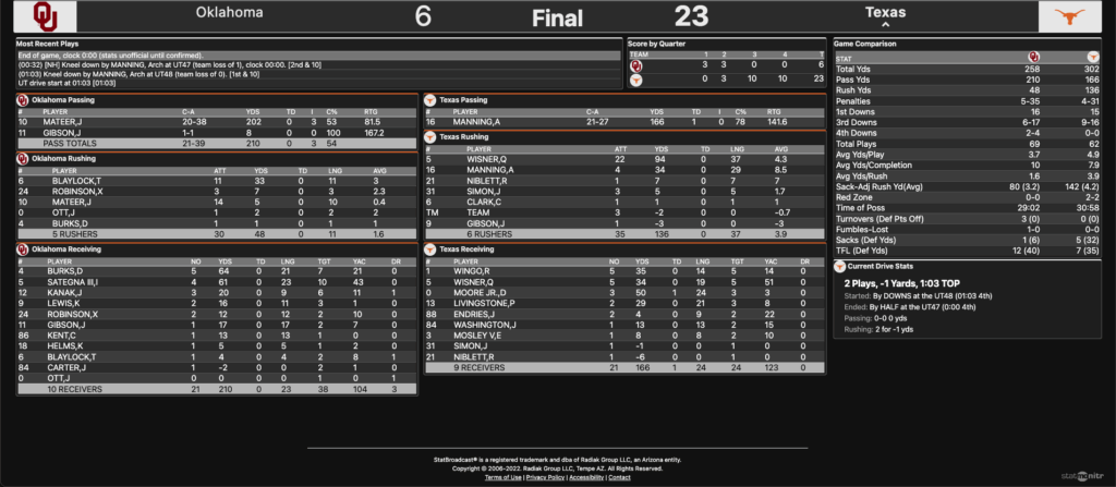 10/11/2025 03:29:04 PMThe defenses showed out through the first quarter as Oklahoma took a 3-0 lead. Texas totaled just 40 yards of offense – 39 of which came from Arch Manning, who threw for 34 yards and rushed for five. The Sooners had 81 total yards, including 71 passing from John Mateer.