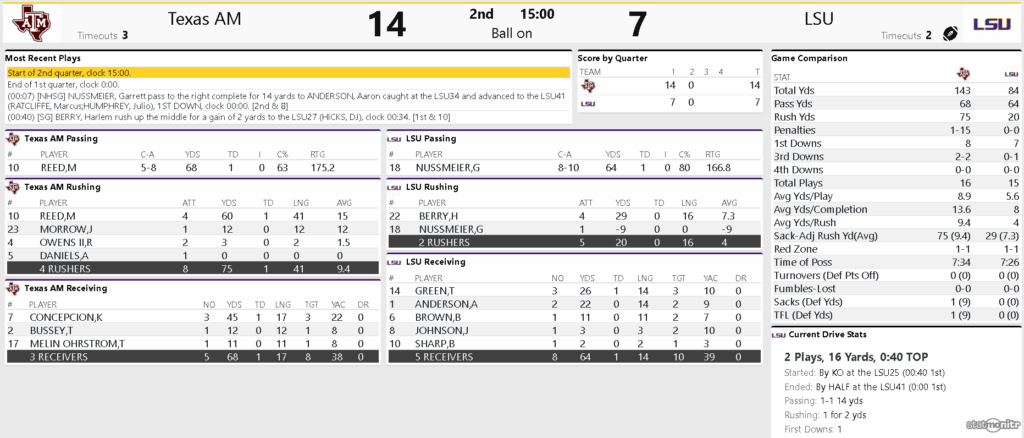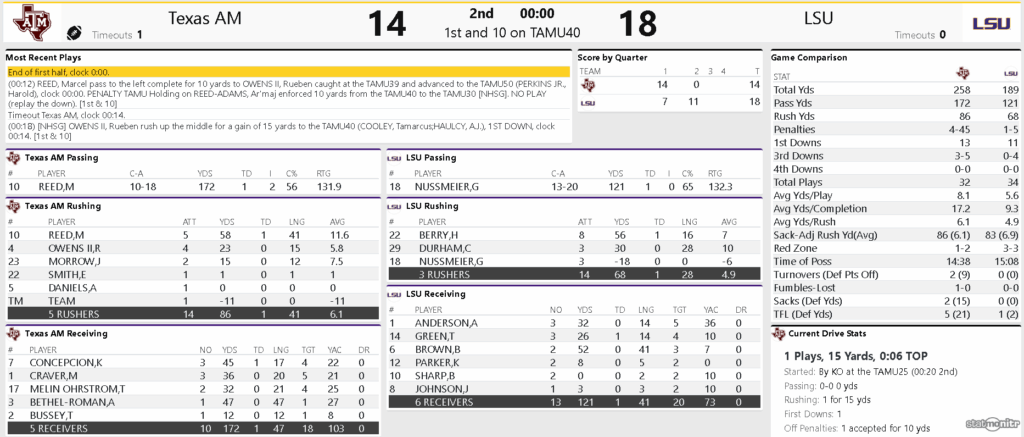 10/25/2025 07:28:42 PMThe first quarter is in the books, and the statistics tell the early story. LSU simply hasn’t been able to stop Marcel Reed or the Texas A&M offense. Here are the stats from the first frame.