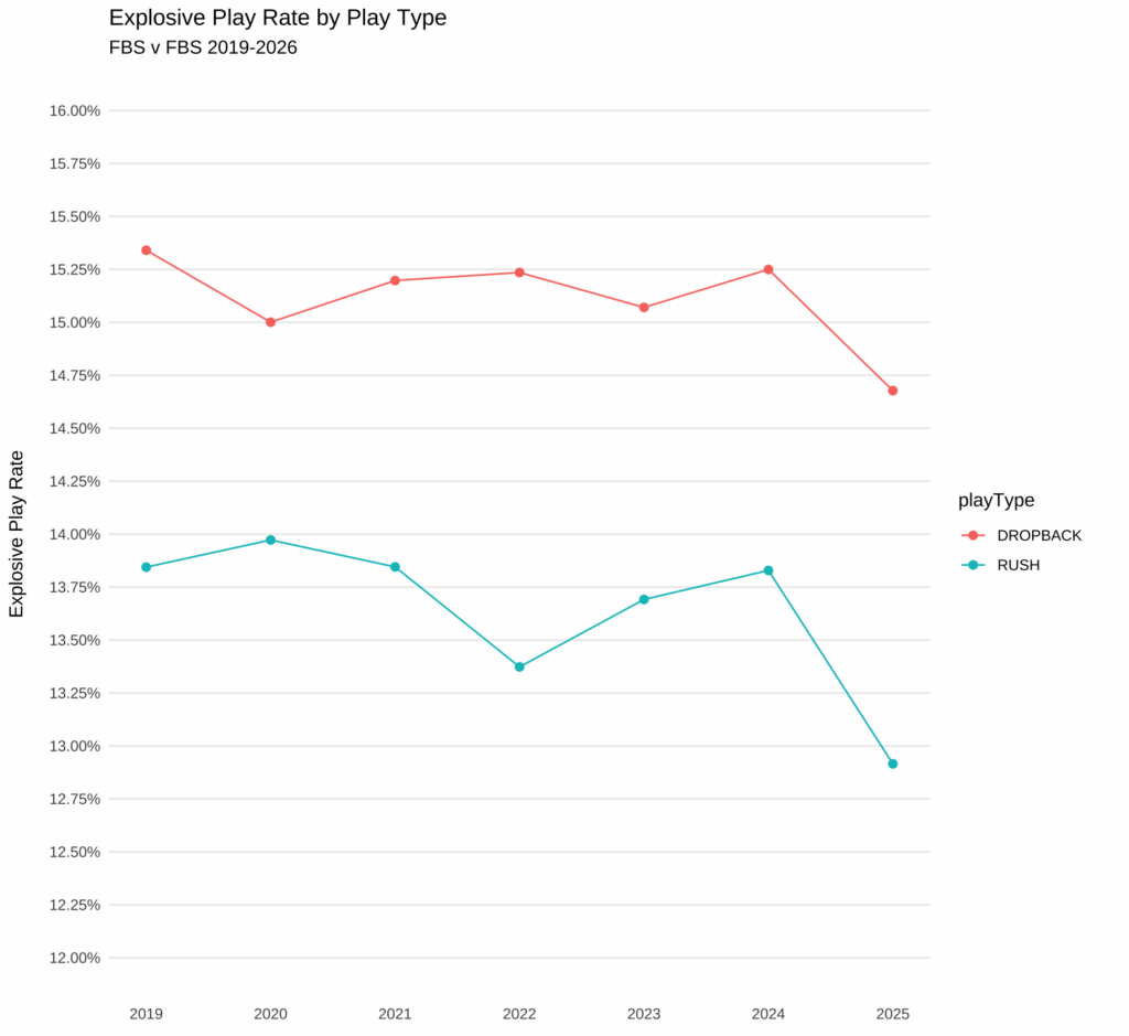 Since 2019 in FBS vs FBS matchups, the national average Explosive Play Rate on dropbacks and designed runs have dipped from 15.3% and 13.8% to 14.7% and 12.9%, respectively.