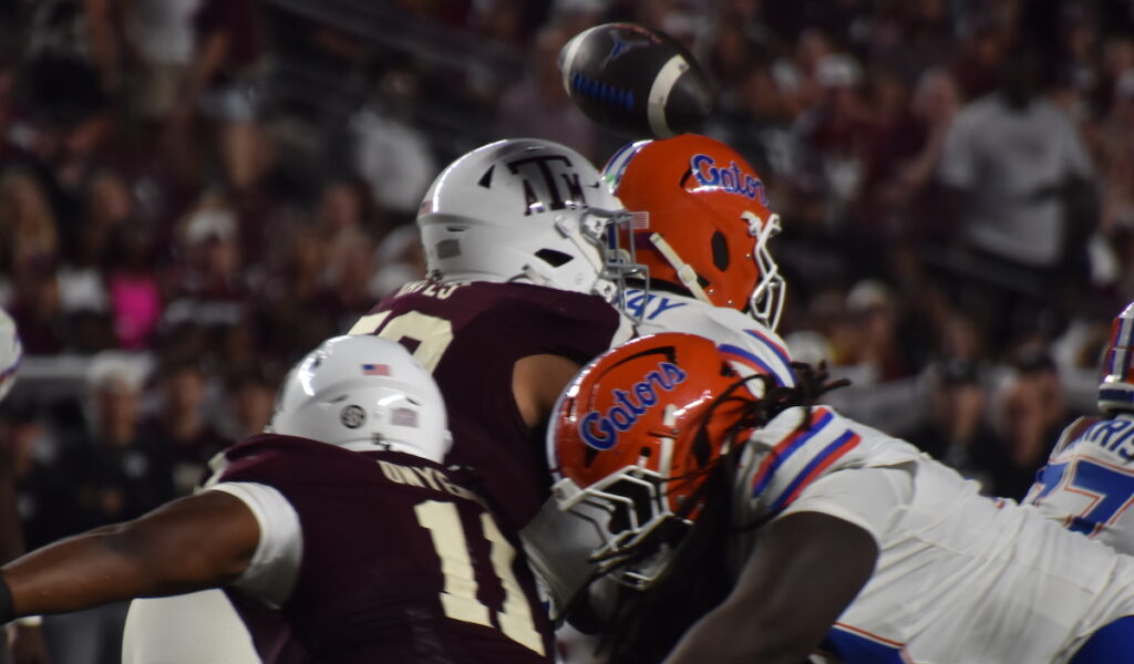 It didn’t take long for the Aggies to start working on their coach’s request. On Florida’s first possession of the second half and already backed up in a 3rd and 16 situation, Lagway threw a quick pass to Brown, who was immediately hit by linebacker Daymion Sanford, who forced a fumble that was recovered by fellow linebacker York at the Gators’ 29-yard line.