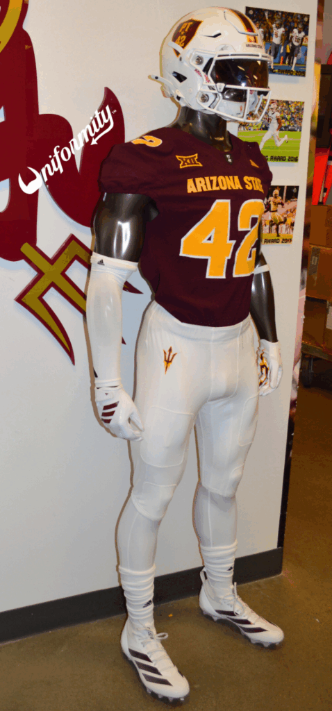 The maroon jerseys feature gold “Arizona State” print in Sun Devil Bold font across the chest, gold player numbers outlined in white on both the front and back of the jersey, as well as the TV numbers on the sleeves. The sleeves also feature angular maroon fabric accents, symbolizing the rays on the Arizona state flag.