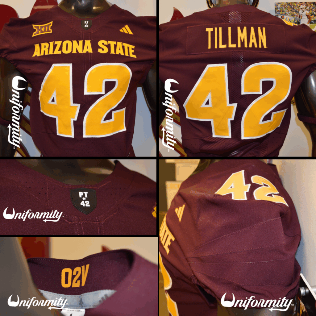 The nameplate on the back of the jersey utilizes the gold plain text font. On the front of the jersey, near the left shoulder, is a gold adidas logo. Near the right shoulder is a maroon and gold Big 12 logo. There is also a gold O2V printed on the inside of the collar, harkening to the final lyrics to the Arizona State fight song, “Onward to Victory.” Last, but not least, at the base of the collar is the black PT*42 shield in honor of ASU Football legend, Pat Tillman.