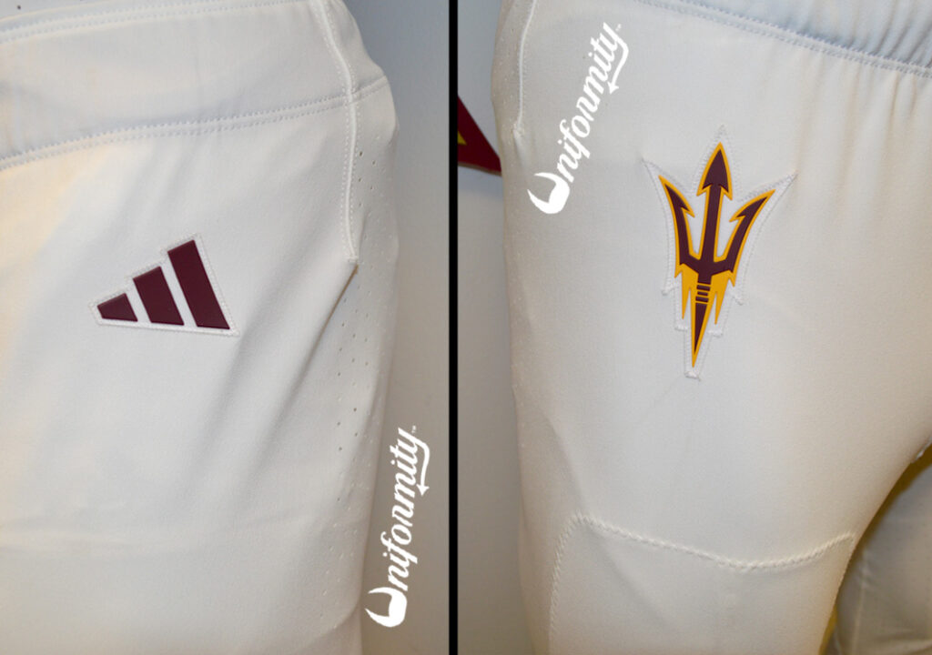 The Sun Devils will wear white gloves, and as with the cleats, there are different gloves for different positions. The gloves on the top are adizeros, which are typically worn by speed position players like wide receivers and defensive backs. The white adizeros feature a maroon pitchfork with gold trim on the palm of each glove. They also have three maroon stripes logo on the back of the hand, a maroon adidas logo on the corner of the wrist strap, and a white, tonal adizero word mark on the pointer finger. The gloves in the middle are adidas Freaks, worn by larger skill position players such as linebackers and tight ends. The white adidas Freak gloves feature the same maroon pitchfork palm design as the adizero, three maroon stripes on the back of the hand, and differ by having a maroon adizero wordmark on the white wristband. Finally, for linemen, the gloves on the bottom are adidas Freak-Max, which boast extra padding on the heel of the palm meant to withstand all of the contact that linemen endure throughout the course of a game. They are plain white with black padding on the palm, and along with a maroon adidas logo on the back of the hand, they also have maroon accents on the knuckles and the black wrist-wrap.