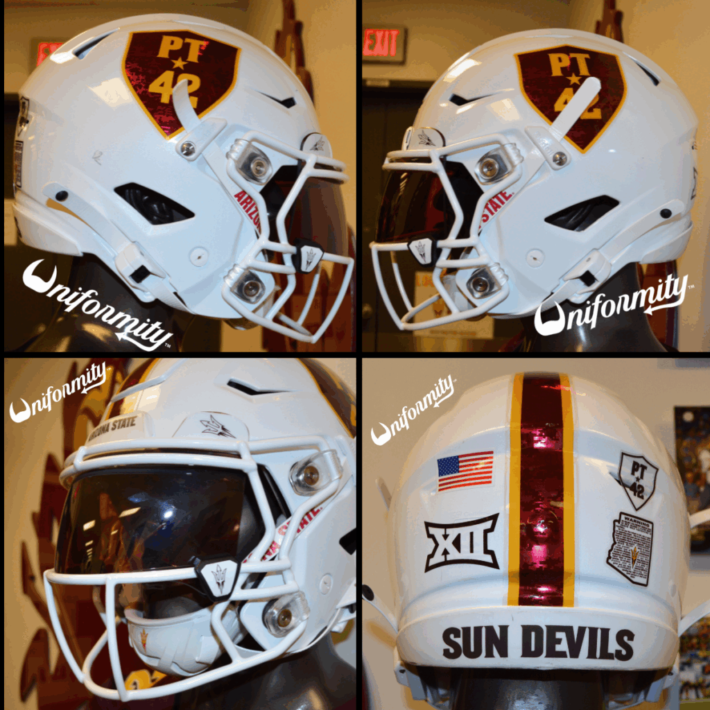 The white helmet features Pat Tillman honor shield decals for the Salute to Service game. The shield has a chrome maroon digicamo base with gold PT*42 print and a gold border. There is also a two-tone center stripe, which boasts a chrome maroon digicamo center outlined by thin strips of gold. The facemask is white, and the front bumper has a white base and maroon “Arizona State” text.
