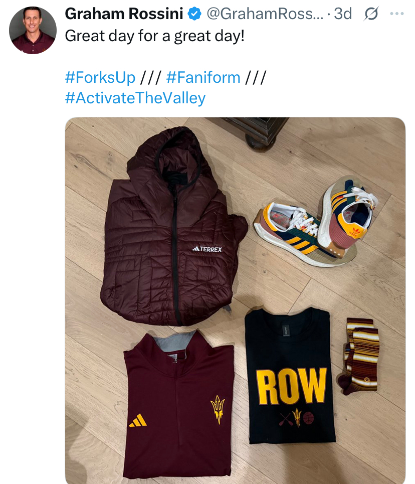 Arizona State Athletic Director Graham Rossini continues to join in the fun of submitting a #faniform each week. While it is still a #faniform, anything submitted from Rossini will never be eligible for the #faniforms presented by Cactus Sports contest. However, we still love to highlight his participation and just how well dressed he is. Last game, Rossini had a maroon Terrex puff jacket, a maroon half-zip fleece that has a maroon pitchfork with gold trim on the left chest and a gold adidas logo on the right chest, and a black shirt that has Sun Devil women’s basketball coach Molly Miller’s “Row” slogan printed in big, bold, gold letters. Below the gold “Row” is a maroon pair of oars, a gold pitchfork with maroon trim, and a maroon basketball. He also wore windy pine style Stance socks and multicolor adidas Retropy E5 shoes, with ASU gold being the color that stood out the most among the assortment of colors on the shoes.