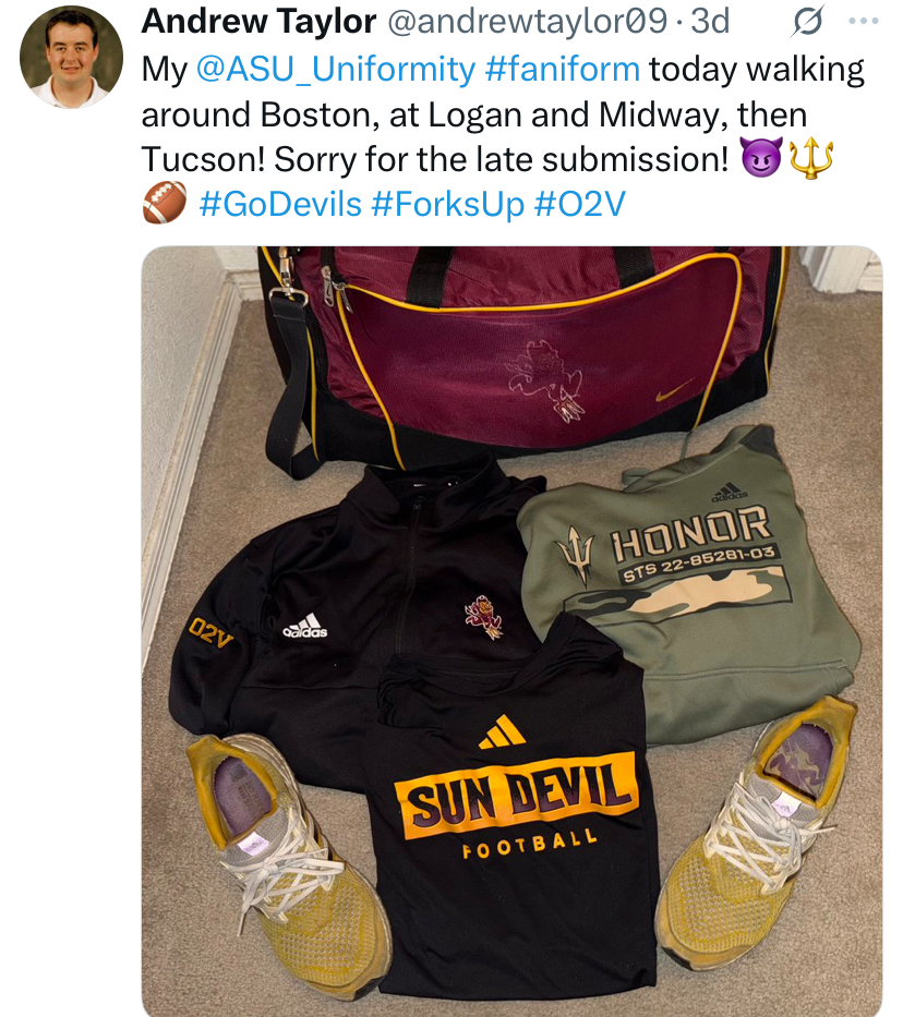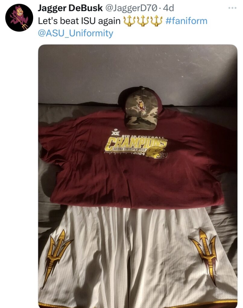 Welcome back to #Faniforms Presented by Cactus Sports! Uniformity loves to highlight your best gameday #faniforms that you wear to support the Sun Devils each week. As a reminder, with Uniformity’s partnership with Cactus Sports, three #faniforms will be chosen at random each week, just like in the past, but this season, there will be a weekly Twitter poll to vote for which of those three #faniforms will become a contest finalist. At the end of the regular season, all of the finalists will be entered into a final vote, with the grand prize being a $125 gift card to Cactus Sports! Reminder, when posting to Twitter, remember to use the hashtag #faniform and tag the Uniformity Twitter account @ASU_Uniformity. Here are this week’s selections! Keep an eye out on Twitter and Instagram for the fan vote! Cast your vote for the best #faniform each week!