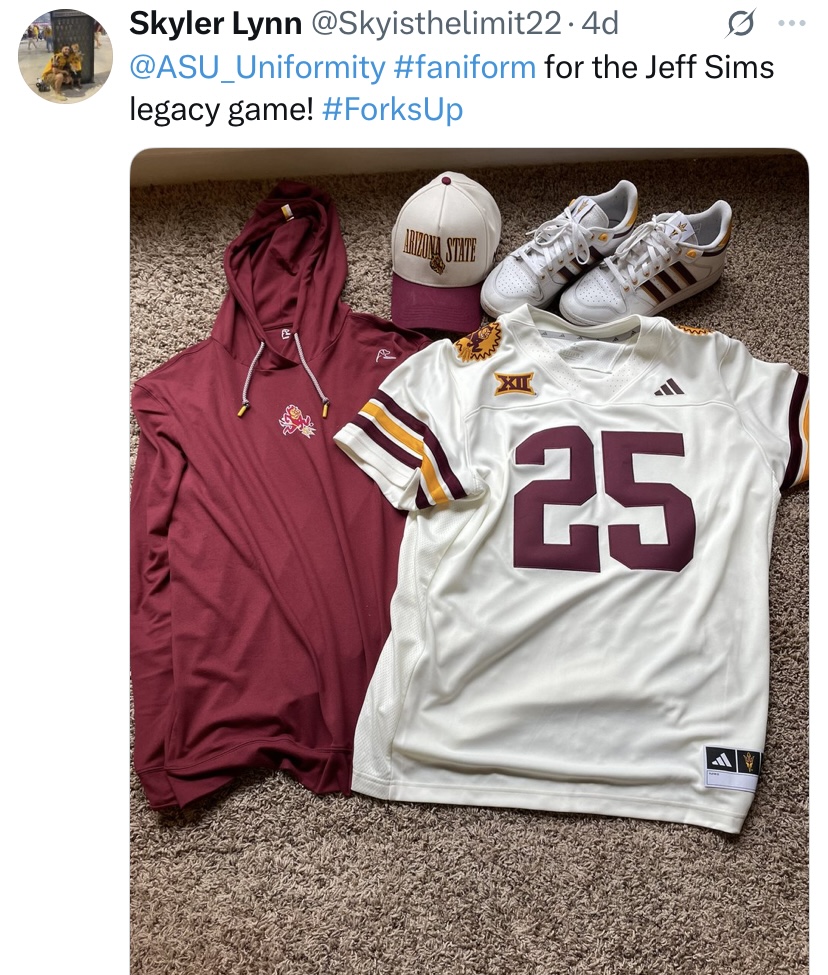 You want more? Ok, fine. The Sun Devils entered cold, rainy Ames, Iowa, following an embarrassing loss to a Houston team they had no business losing to. They limped into the contest, literally and figuratively, with starting quarterback Sam Leavitt out for the season, and star wide receiver Jordyn Tyson still out nursing a strained hamstring. ASU hasn’t lost back-to-back games since the 2023 season, but with the injuries mounting, going on the road in bad weather against a tough Iowa State team would lead one to believe that it would be difficult to avoid such a fate. Enter Jeff Sims. In his third start as a Sun Devil, quarterback Jeff Sims put the team on his back, running for 228 yards and two touchdowns while also throwing for 177 yards and a touchdown. In the rainy conditions, Sims did turn the ball over, losing two fumbles and throwing an interception, a characteristic that has plagued him in the past, but he overcame that and a plethora of Sun Devil penalties to will his team to victory. In a time when Sun Devil fans were thinking things were looking dark, Sims ignited the light of hope for the remainder of the season. Not only that, but he did it in a great looking uniform. His jersey from that game is now hanging in the Sun Devil Athletics Hall of Fame after setting a single-game record for rushing yards by a quarterback. Let’s talk about that uniform that Sims and the Sun Devils wore against Iowa State.