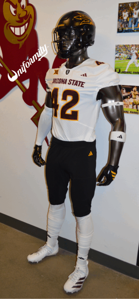 The white jerseys feature maroon “Arizona State” print in Sun Devil Bold font across the chest, maroon player numbers with gold outline on both the front and back of the jersey, as well as the TV numbers on the top of the sleeves. The sleeves feature angular white fabric accents that represent the rays of the Arizona state flag.
