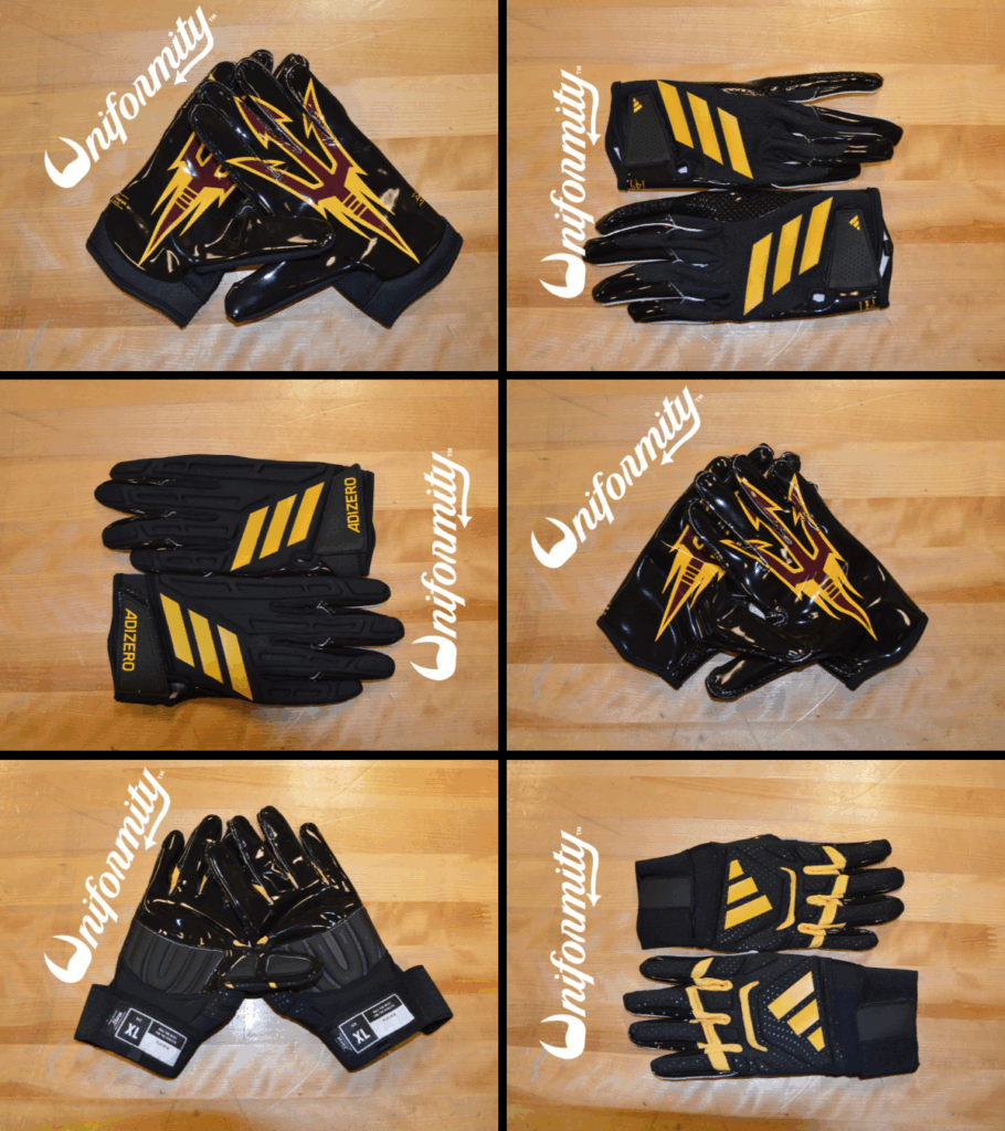 The Sun Devils will wear black gloves, and as with the cleats, there are different gloves for different positions. The gloves on the top are adizeros, which are typically worn by speed position players like wide receivers and defensive backs. The black adizeros feature a maroon pitchfork with gold trim on the palm of each glove. They also have a three gold stripes logo on the back of the hand, a gold adidas logo on the corner of the wrist strap, and a black, tonal adizero word mark on the pointer finger. The gloves in the middle are adidas Freaks, worn by larger skill position players such as linebackers and tight ends. The black adidas Freak gloves feature the same maroon pitchfork palm design as the adizero, three gold stripes on the back of the hand, and differ by having a gold adizero wordmark on the black wristband. Finally, for linemen, the gloves on the bottom are adidas Freak-Max, which boast extra padding on the heel of the palm meant to withstand all of the contact that linemen endure throughout the course of a game. They are plain black with black padding on the palm, and along with a gold adidas logo on the back of the hand, they also have gold accents on the knuckles and the black wrist-wrap.