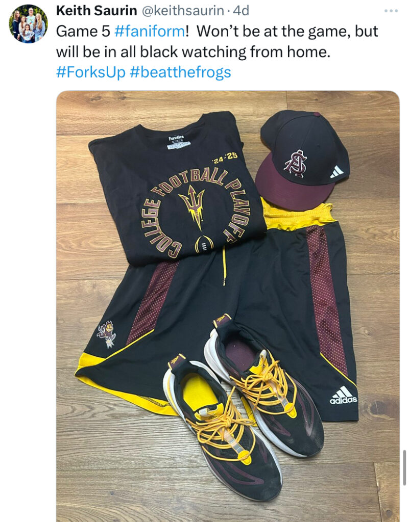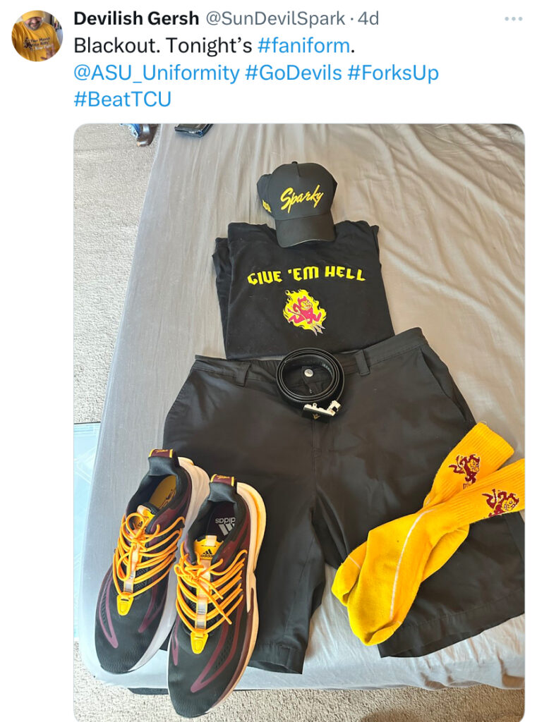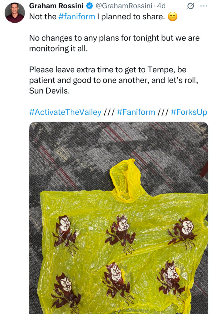 Arizona State Athletic Director Graham Rossini continues to join in the fun of submitting a #faniform each week. While it is still a #faniform, anything submitted from Rossini will never be eligible for the #faniforms presented by Cactus Sports contest. However, we still love to highlight his participation and just how well-dressed he is. Last game, Rossini gold poncho with a Sparky pattern, while the athletic department scrambled to keep the seats and field dry as the largest day of rainfall in years wreaked havoc before the game against TCU. We can only assume that Rossini was dressed to the nines, as per usual, beneath that poncho. All that said, he, the grounds crew, and everyone else who had boots on the ground did an incredible job making Mountain America Stadium a safe and comfortable environment to watch the game despite the unfavorable weather conditions leading up to kickoff.