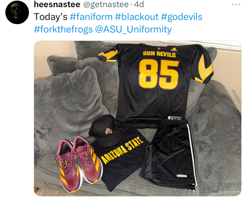 Welcome back to #Faniforms Presented by Cactus Sports! Uniformity loves to highlight your best gameday #faniforms that you wear to support the Sun Devils each week. As a reminder, with Uniformity’s partnership with Cactus Sports, three #faniforms will be chosen at random each week, just like in the past, but this season, there will be a weekly Twitter poll to vote for which of those three #faniforms will become a contest finalist. At the end of the regular season, all of the finalists will be entered into a final vote, with the grand prize being a $125 gift card to Cactus Sports! Reminder, when posting to Twitter, remember to use the hashtag #faniform and tag the Uniformity Twitter account @ASU_Uniformity. Here are this week’s selections! Keep an eye out on Twitter and Instagram for the fan vote! Cast your vote for the best #faniform each week!