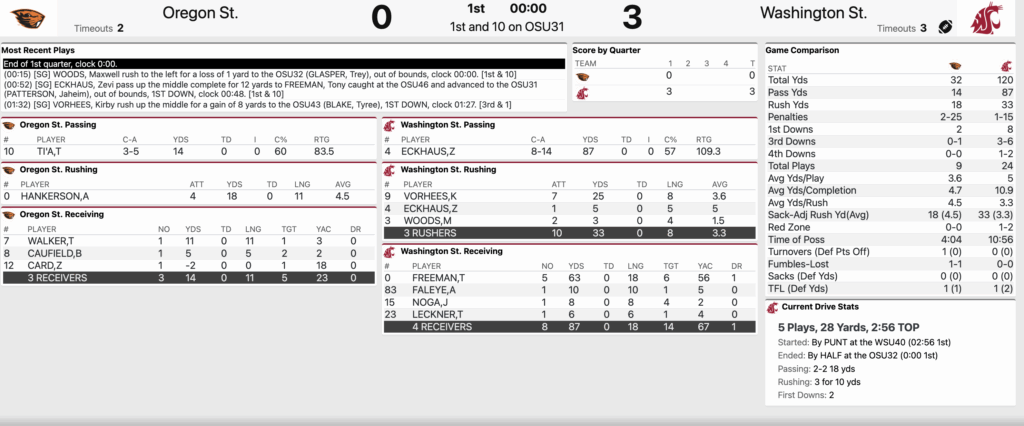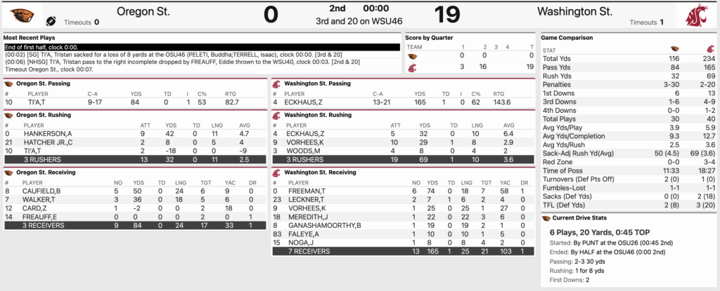 11/29/2025 07:52:42 PMComing out of the halftime break, Oregon State’s offense has continued to struggle to move the ball, with two punts on its two drives. WSU punted on its lone drive as well, but has the ball at the OSU 27 with 7:06 left in Q3…