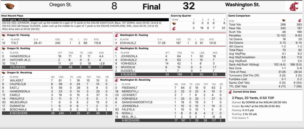 11/29/2025 09:01:52 PMAfter Oregon State attempted an onside kick, Washington State recovered and promptly scored a touchdown on an Angel Johnson-led drive. The Cougars went 44 yards in three plays to extend the lead to 32-8…