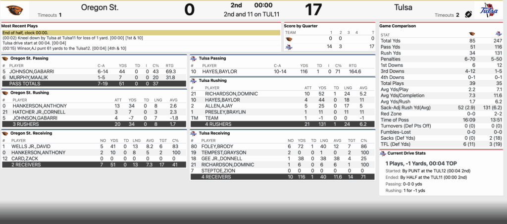 11/15/2025 01:07:32 PMThe Golden Hurricane wave continues to roll in Tulsa, as they’ve taken a 17-0 advantage with 6:25 left in the second quarter by way of a 25-yard field goal. Tulsa has racked up 174 yards to Oregon State’s 69, and the Beavers are still searching for their first points.