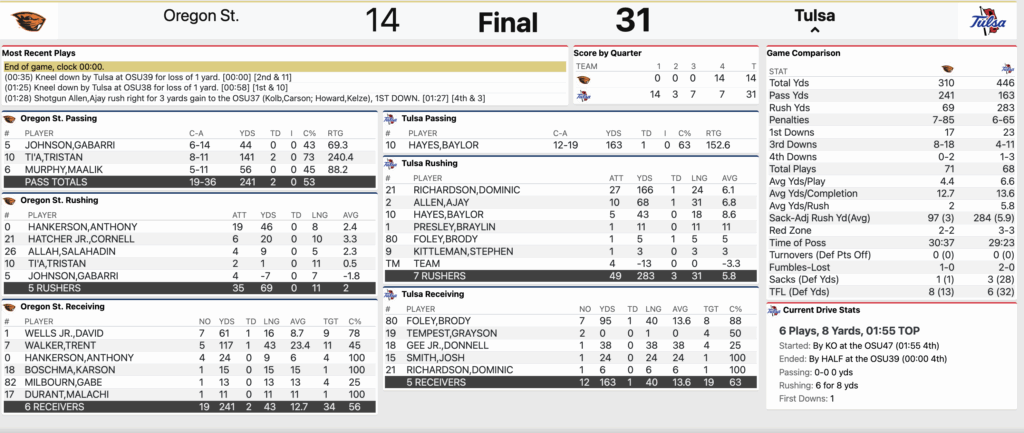 11/15/2025 03:14:22 PMThe Oregon State football team (2-9) fell to Tulsa 31-14 on Saturday afternoon… Tulsa controlled the entire game from start to finish, and outside of the breakout of QB Tristan Ti’a, the Beavers didn’t have a whole lot of positives to hang their hats on… They’ll have a bye week next week before facing Washington State in Pullman on Nov. 29th