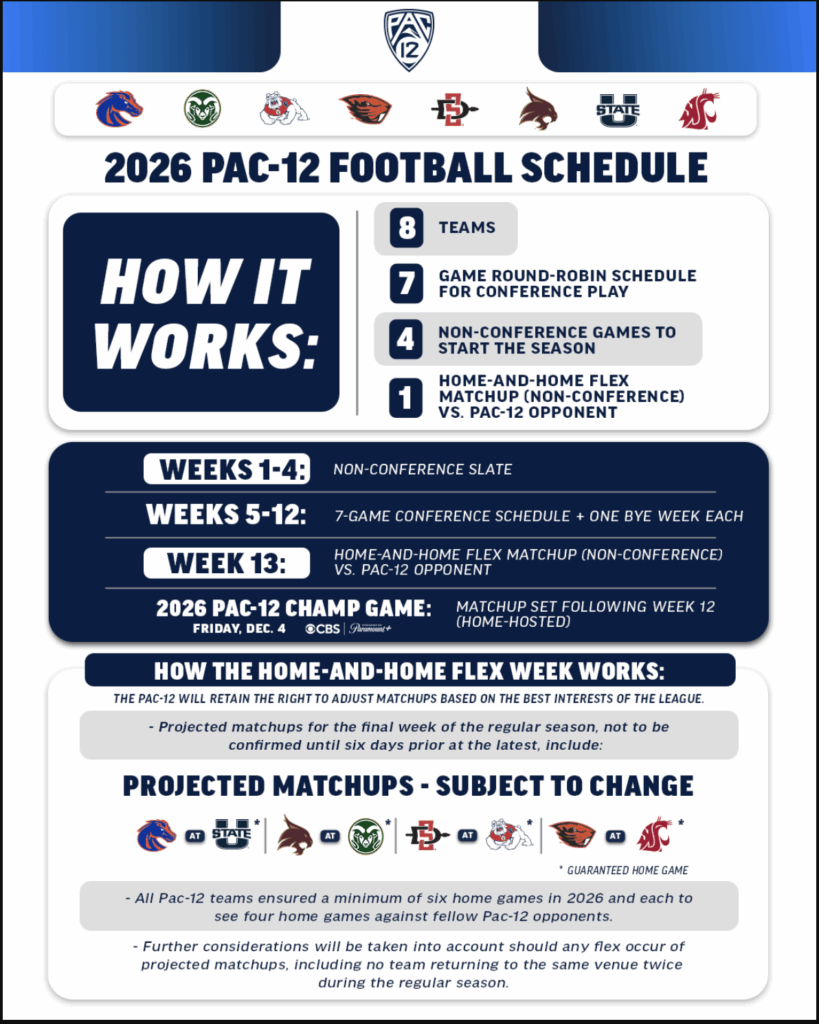 For 2026 and the league’s home-and-home flex matchup to conclude the regular season in Week 13, the Pac-12 will retain the right to adjust matchups based on the best interests of the league, including College Football Playoff (CFP) considerations at that time. Projected matchups for the final week on Saturday, Nov. 28, not to be confirmed until six days prior at latest, include: