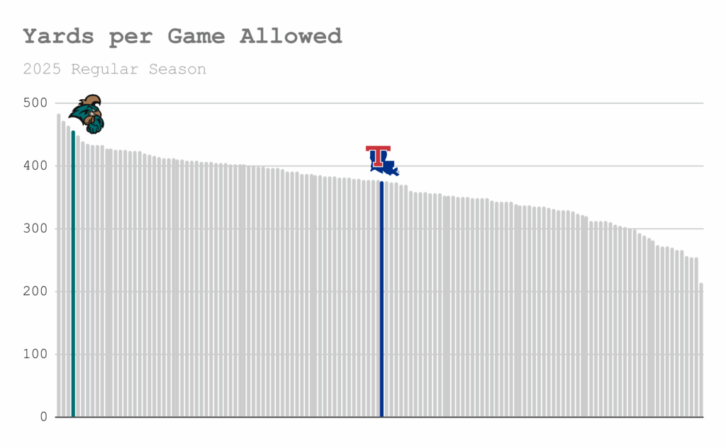 And while yards allowed doesn’t necessarily equate to points allowed, the Chanticleer defense broke nearly as much as it bent, ranking 9th worst in college football with 34 points allowed per game.