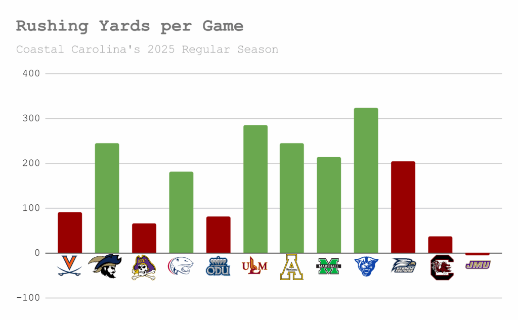 That something is the run game. Only once all year did Coastal Carolina rush for more than 100 yards and lose the game. That lone exception was their road loss to Georgia Southern, which happened to be their only one-possession loss of the season. In fact, the difference between their good rushing games and their bad ones is pretty drastic: