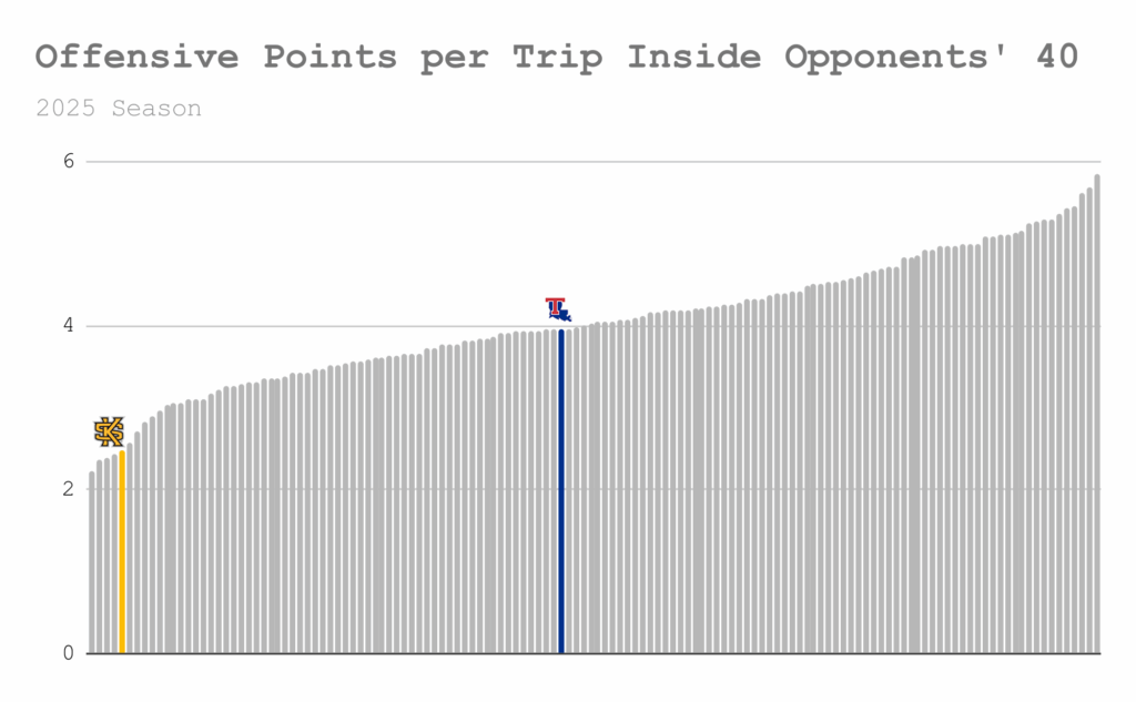 Kennesaw ranks 7th-worst in the country in scoring efficiency once inside the 40. Meanwhile, the Tech defense allows the 2nd-fewest points per trip in that same area. That’s not good news if you’re an Owl fan.