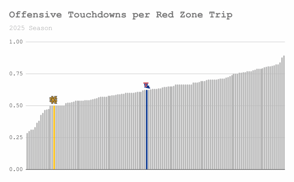 And things don’t get much better when Kennesaw does crack the red zone. The Owls have reached the 20-yard line 16 times this season but have only found the end zone eight times: