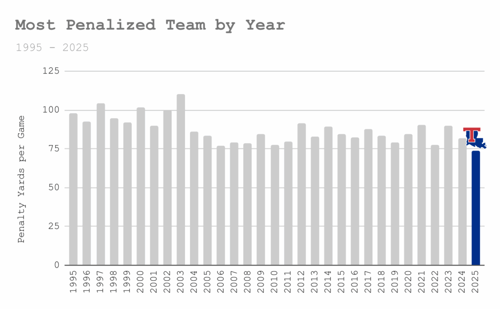 To be fair to the Bulldogs, this isn’t some historically undisciplined team. Looking as far back as 1995, every season has had at least one team average more penalty yards per game than Tech’s current mark: