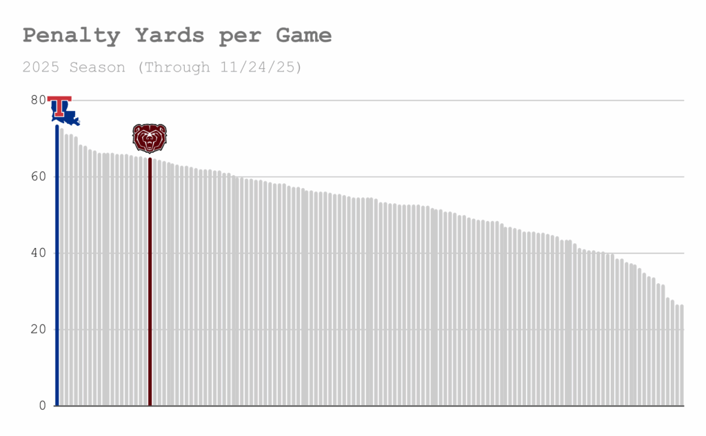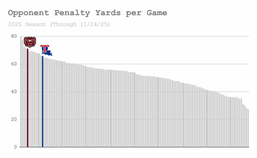 Of course, one team’s penalties rarely exist in a vacuum. A trigger-happy officiating crew or two on one team’s schedule could skew our comparison. And that might be what’s happened with both Louisiana Tech and Missouri State: