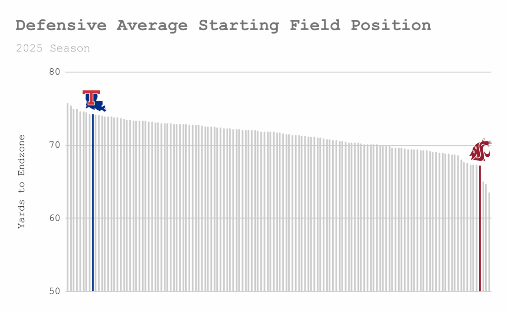 Defensive Starting Field Position measures where a defense begins its drives. In other words, how long of a field the opposing offense has to work with. Or, alternatively, how much room a defense has to bend before it breaks.