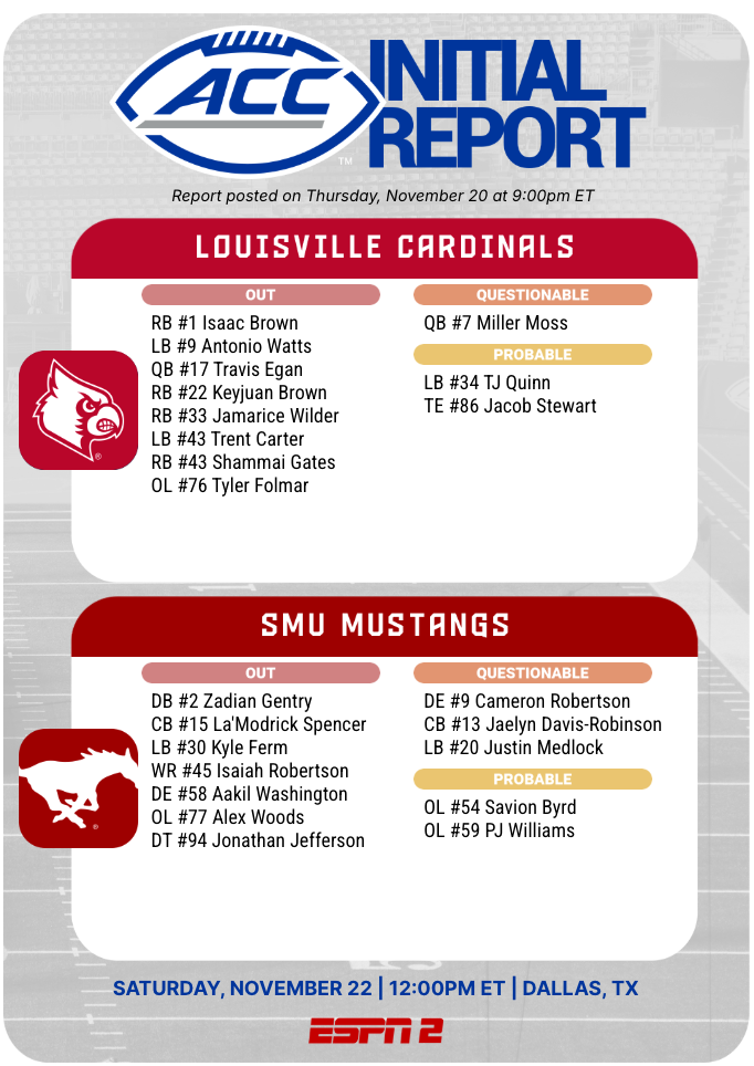 Once more, Louisville football will be down several starters as the Cardinals head to SMU (7-3, 5-1) in the final road game of the season.