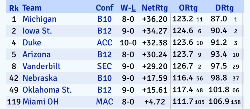 The Red Hawks haven’t played anyone inside Kenpom’s top 200 yet. But hey, 8-0 is 8-0, and make no mistake, Miami (OH) was picked second in the Mid-American preseason and could be playing in March Madness. I don’t see a loss until an in-state rivalry game against a top-60 Kenpom team in Akron.