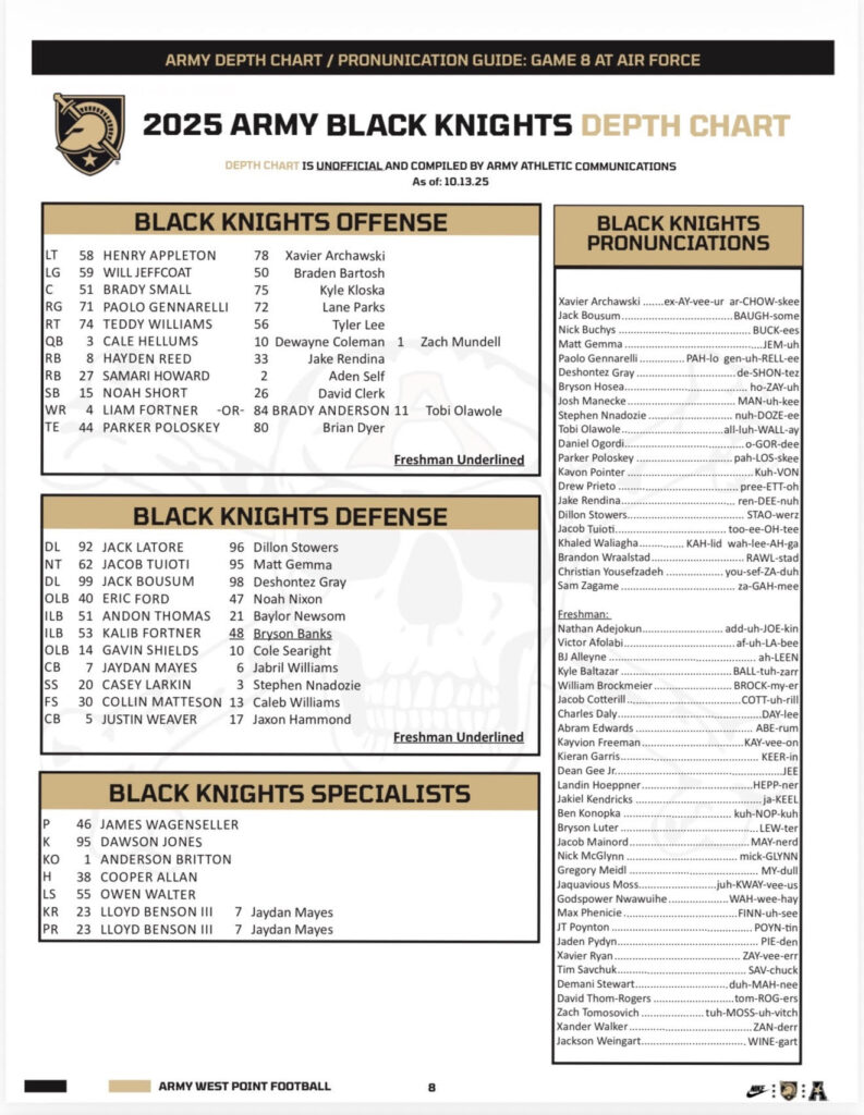 Szarka is the Falcons’ engine. Army must contain his scrambling and deep shots to Cade Harris and Quin Smith.