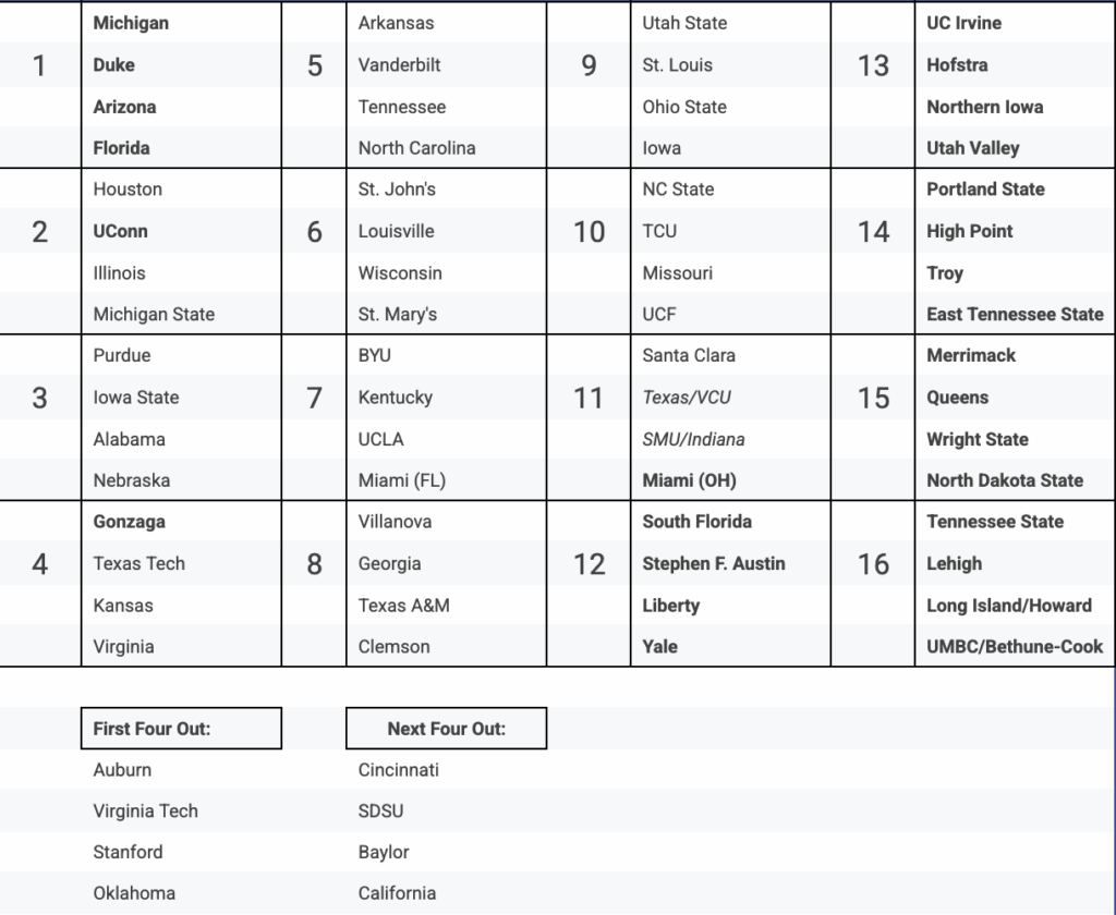 Teams listed in bold are the predicted automatic qualifiers for each respective conference. For instance, Florida is in bold as the predicted auto-bid winner for the SEC. Each conference receives one auto-bid, 31 in total, while there are 37 at-large bids.