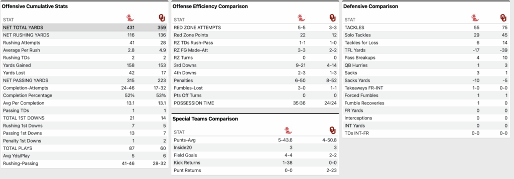 The Sooners finished the game with 359 total yards but scored on just five of their 13 offensive possessions.