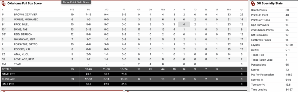 Outside of Pack, the Sooners struggled to find consistent scoring until late in the game. Tae Davis finished with a double-double of 13 points and 15 rebounds, but he shot just 5/13 while leading the team in shot attempts.