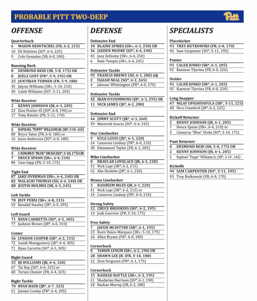 The Panthers released their latest two-deep depth chart for the Syracuse matchup on Monday. Of note, defensive end Zach Crothers and cornerback Nigel Maynard have both been removed after suffering season-ending injuries, Pat Narduzzi announced Monday.