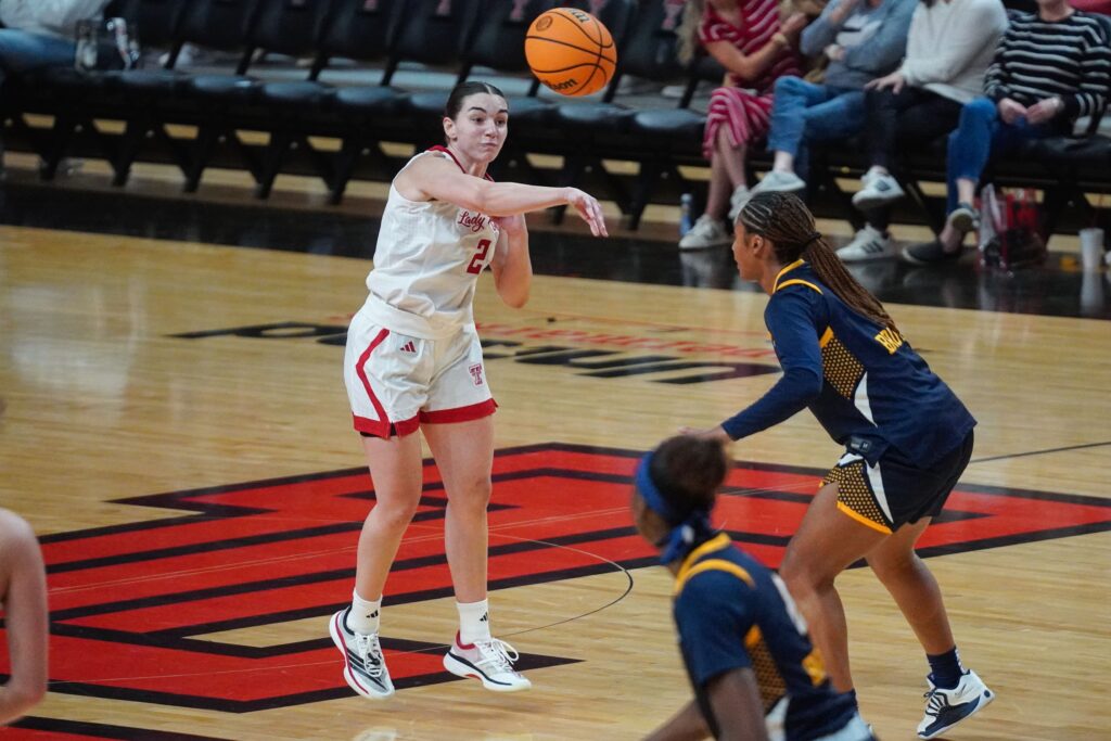 If there were any first-game nerves, Núñez never showed them. The senior transfer from Campbell ran the offense with poise, controlled the tempo and anchored Tech’s full-court press. Her presence was instantaneous, making a pass on the first offensive possession that led to Bristow free throws followed by her joining with Bristow on a trap in the press to force a jump ball. She was everywhere and finished with 15 points, 5 rebounds, 4 assists and 4 steals – a stat line that looked like it came from someone who’s been in this system for years, not weeks.