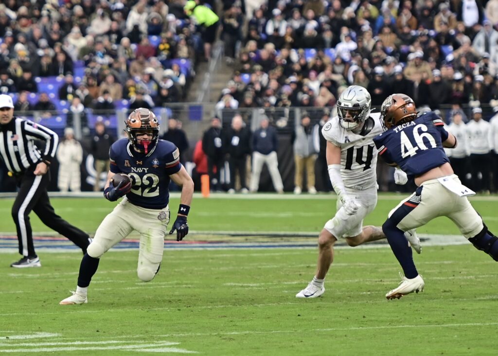 Navy’s Eli Heidenreich (#22) rushes right for a 9 yard gain to the Army13. 1ST DOWN.