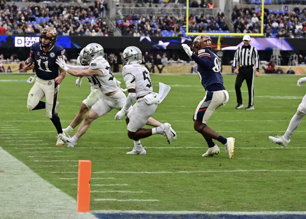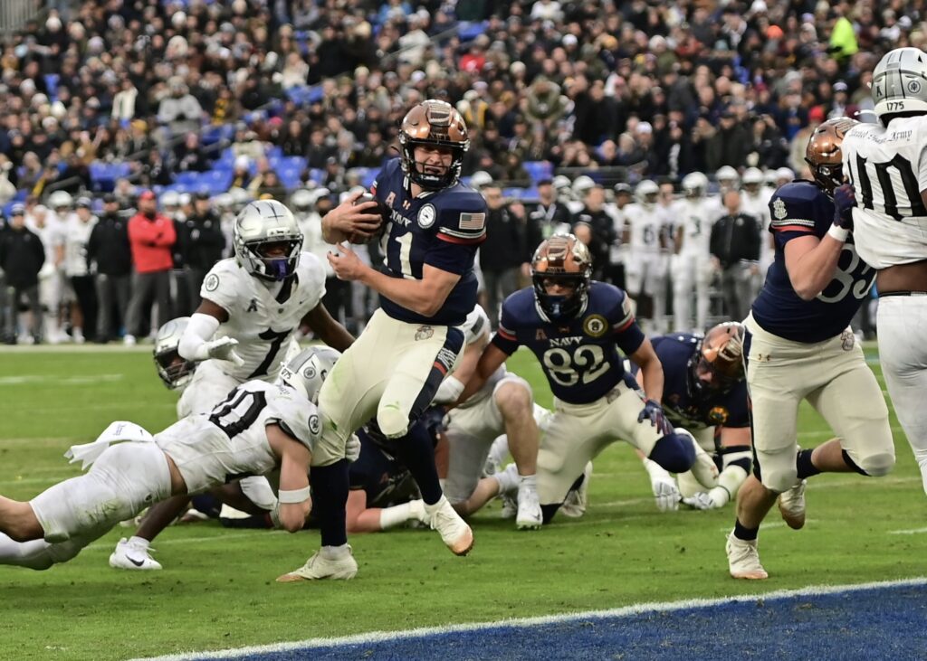 Navy’s Blake Horvath (#11) rushes right for a 3 yard gain to the Army13, out-of-bounds.