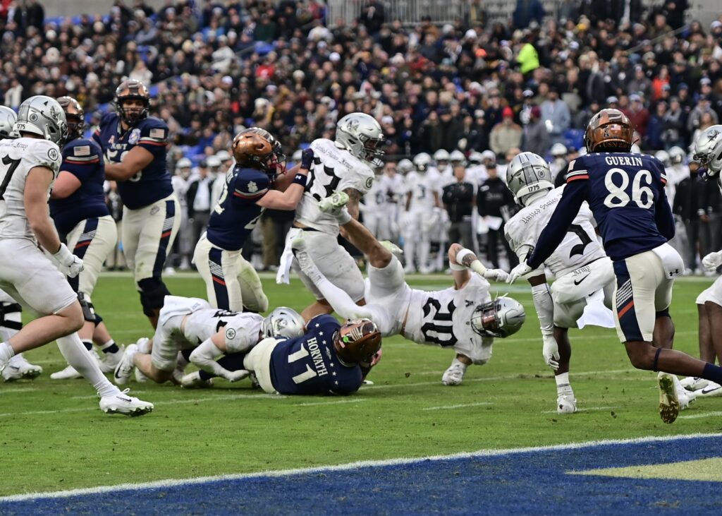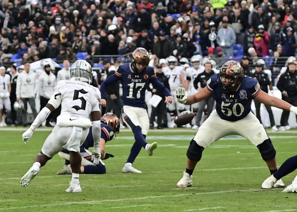 Army #15 (Noah Short) rushes right for a 2 yard gain to the Navy21. Navy’s Julien Moutome (#90) and Griffen Willis (#95) are credited with the stop.