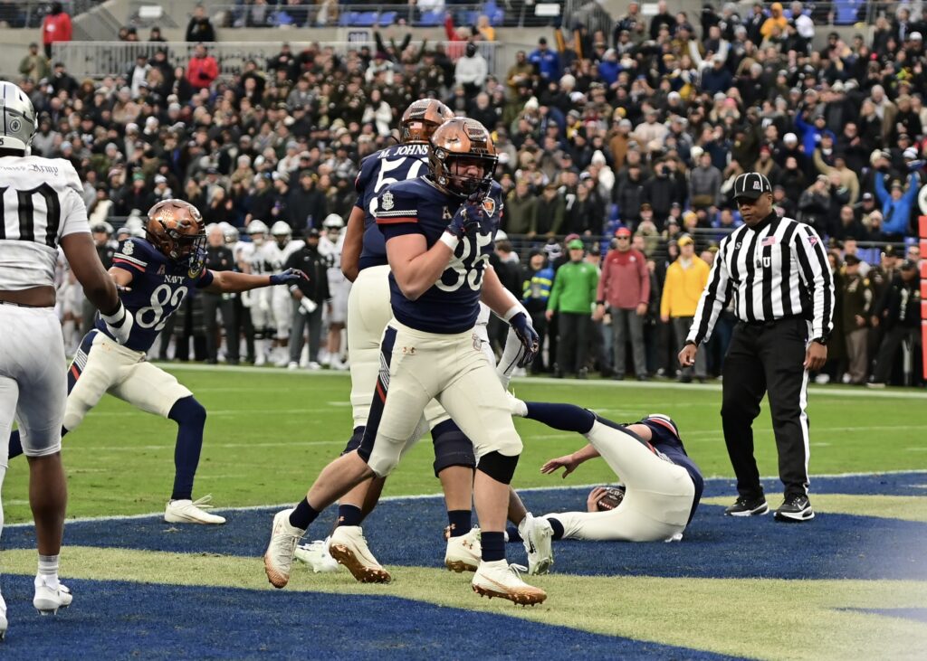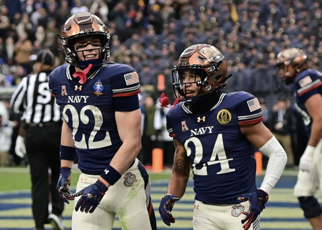 Navy’s Eli Heidenreich (#22) and Brandon Chatman (#24) celebrate the score.